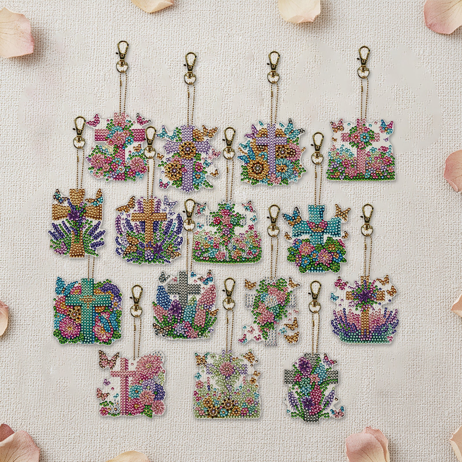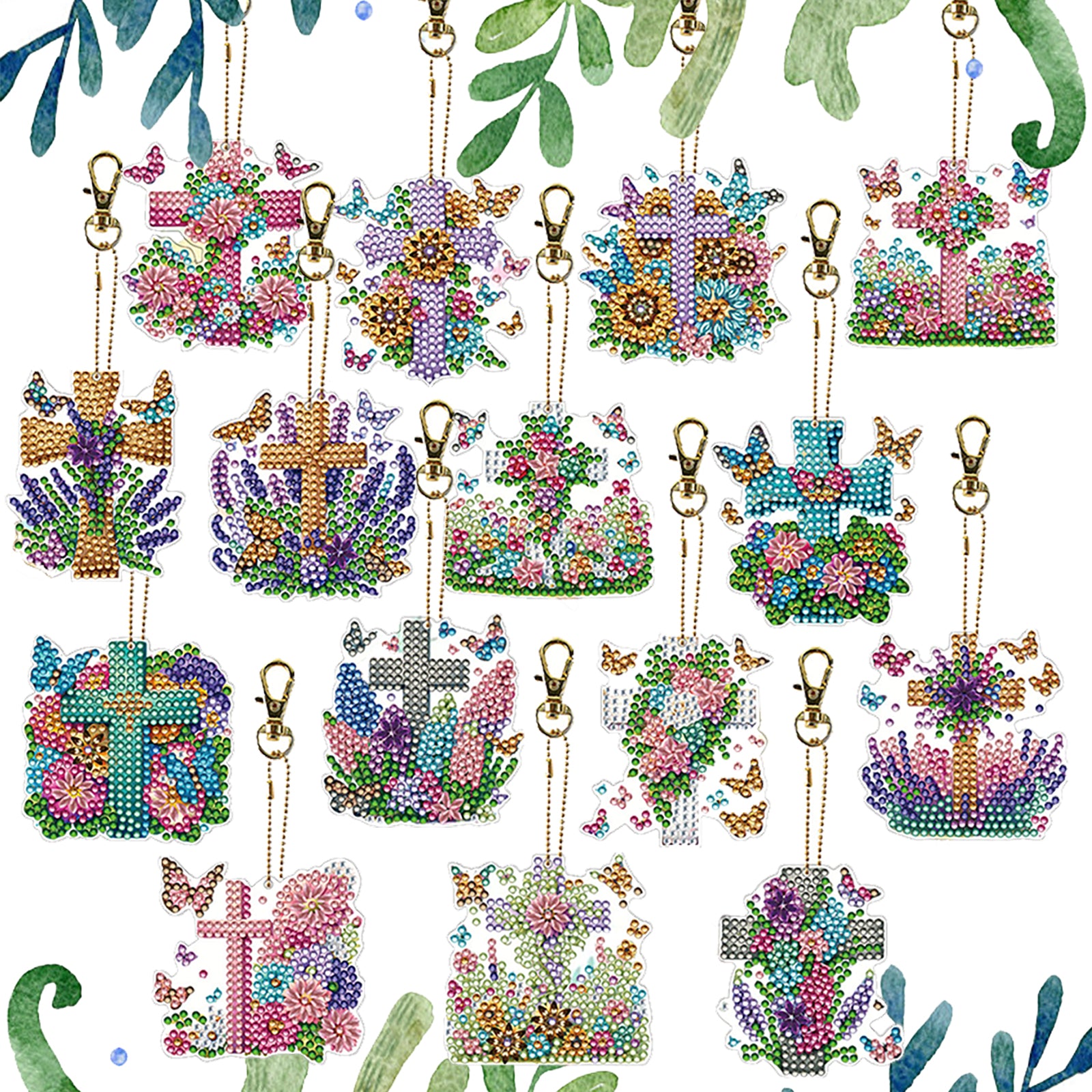 15Pcs Flowers Crosses DiY Double-Sided Diamond Art Keychain Ornament Party Decor