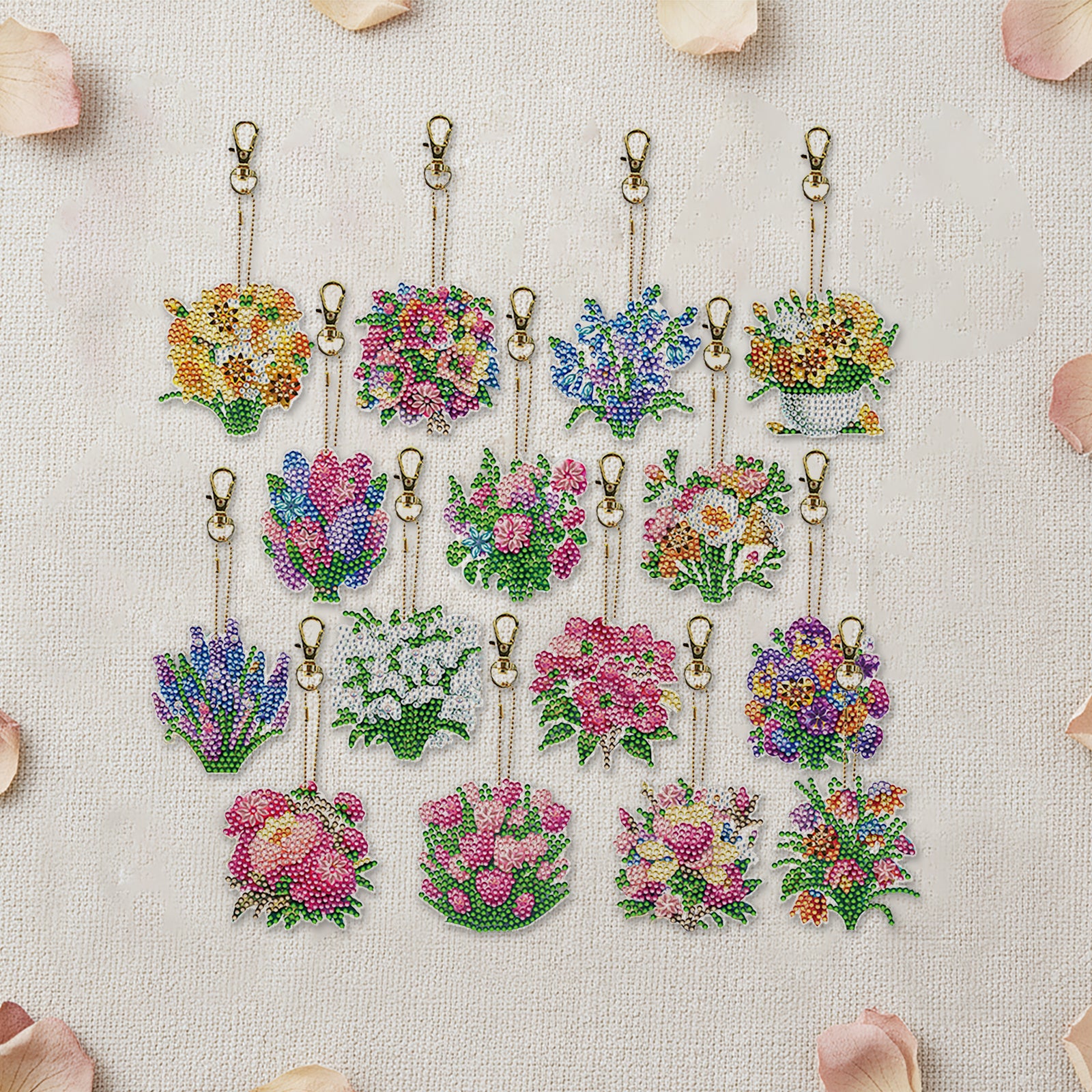 15Pcs Flowers DiY Double-Sided Diamond Art Keychain Ornaments Party Crafts Decor