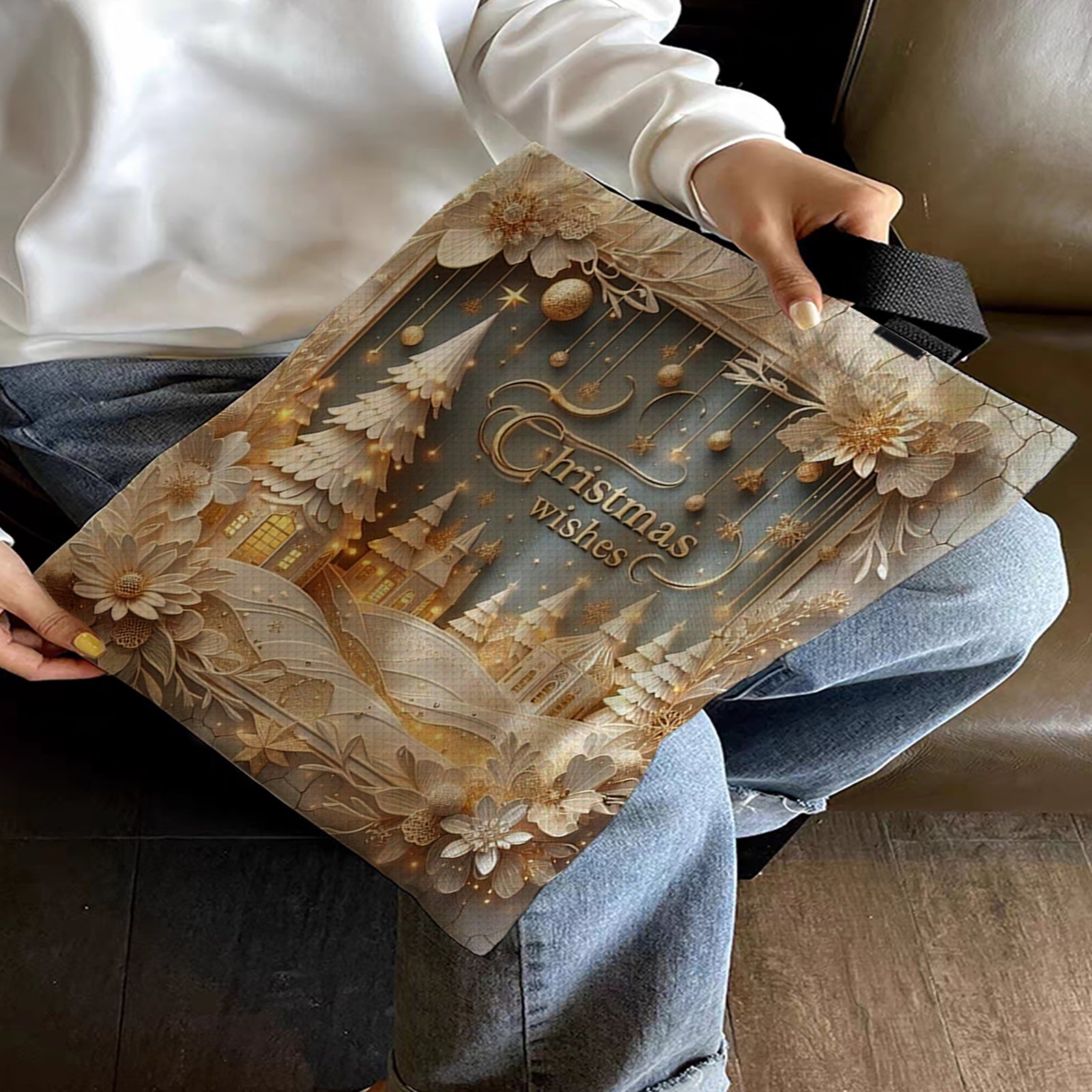 Christmas Scenery Canvas Tote Bag Embroidery Kit 11CT Print 40*40cm for Beginner