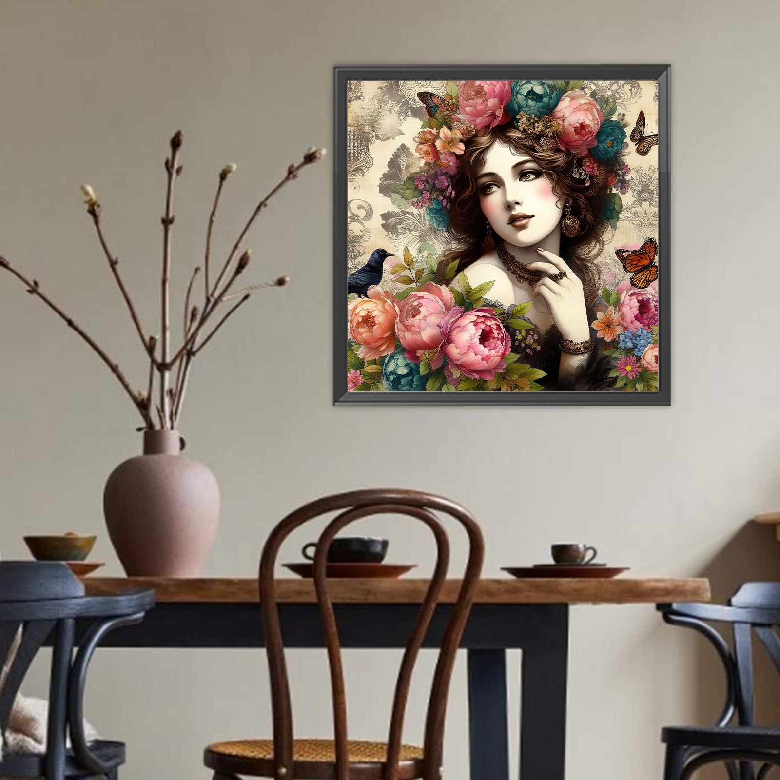 Vintage Girl And Flowers - Full Round Drill Diamond Painting 40*40CM